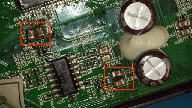That said, let's replace C204, C217, C231, C236, C247, C260, C275 and C284. It looks like 16V/10uF might be an appropriate choice by design, I went for 50V/1uF for better resilience.