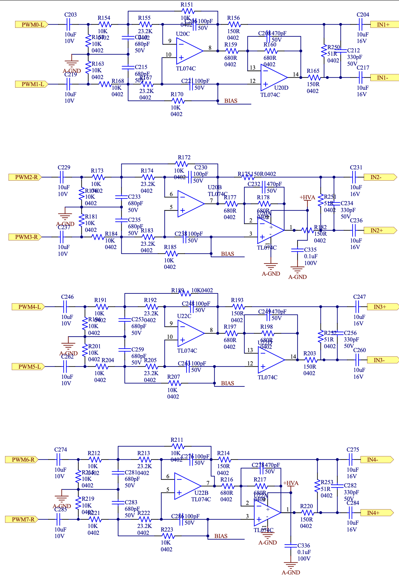I did not expect an easy fix and it took me a couple of attempts to get this repaired. Per the link below it was worth checking DC blocking caps between the TL074C and the TPA 3118.